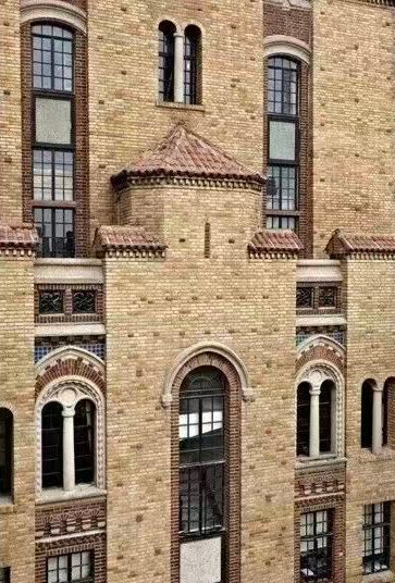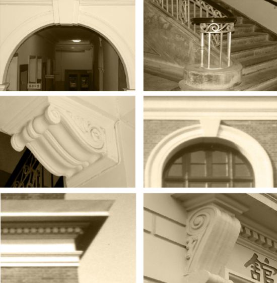 該體育館的內外裝飾風格簡潔統一,設計精妙。其入口雖不宏大但十分精致,富有層次的門框增強了立體感與辨識度。此設計理念貫穿全樓:立面上的拱券窗層層內收,形成“透視窗”效果,并與室內廊口、梁柱的線腳形式呼應。在細節上,檐部線條比例精準,光影效果佳;室內樓梯的渦狀端部與鐵制欄桿的倒“S”形渦紋,則共同賦予建筑輕巧細膩的質感。