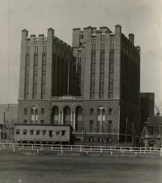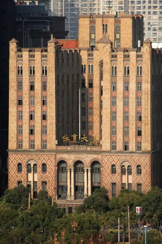 1928年5月,體育館落成。坐北朝南,由以設計美國近代立體形式而著名的哈沙德洋行主持設計,具體負責的是建筑師安鐸生。此樓設計采用美國工藝美術派風格,仿芝加哥瑞萊斯大廈,外形及裝飾略帶古典式樣,外立面用的是橫三段豎三段的形式。外墻底層砌深棕色面磚,顯出凹凸線。大門口豎立2米多高的金屬燈柱,柱上和柱基均飾以植物圖案浮雕,燈柱下有4個小獅頭,門窗是方框形。二、三層中部有穹形長窗直貫于兩層間。墻面淺黃底色上嵌深棕色磚,構成菱形圖案。四層以上,墻面呈直線凸凹狀,左右各凸出四柱,凹進窗戶,窗下有淺色花飾。