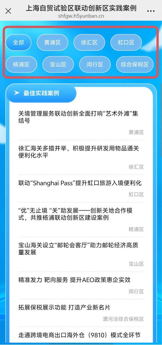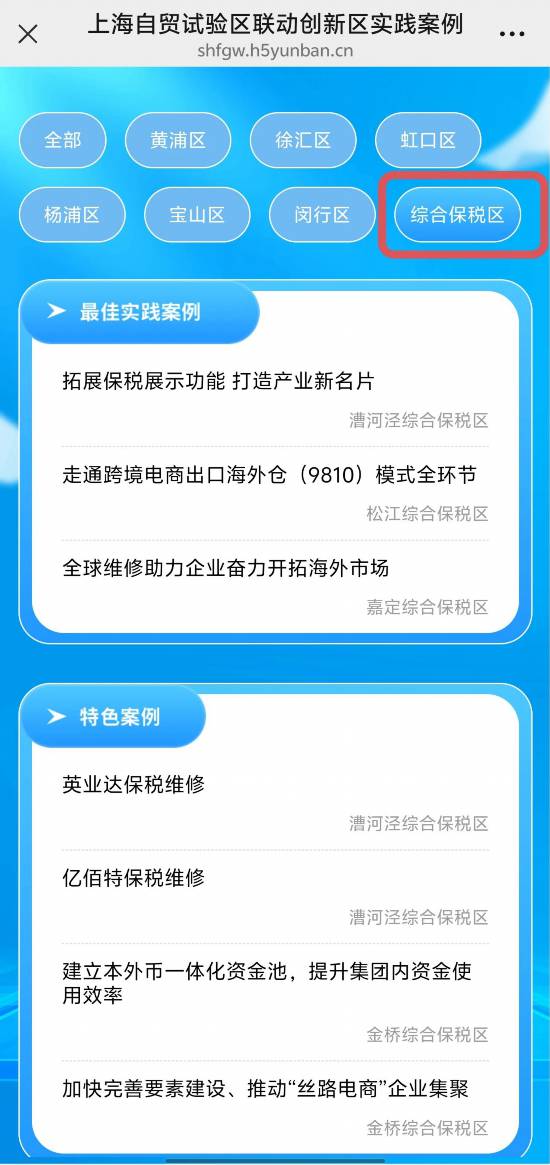 可按區域進行了篩選,包括黃浦區、徐匯區、虹口區、楊浦區、寶山區、閔行區、綜合保稅區等,點擊相應區域,可查看對應的最佳實踐案例和特色案例。