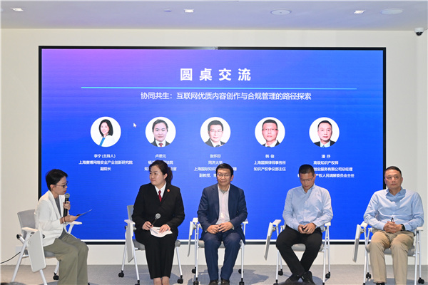 圓桌討論環節由賽博研究院副院長李寧主持,楊浦區人民法院盧思元法官、同濟大學張懷印副教授、上海國獅律師事務所韓俊律師以及上海上理創業服務有限公司總經理潘抒共同參與。嘉賓們圍繞“協同共生:互聯網優質內容創作與合規管理的路徑探索”展開深入交流,提出在技術快速迭代的背景下,亟需構建多方協同的治理體系:司法層面應通過精細化審判明確平臺責任,探索AI生成內容的權利認定規則;創作者應樹立“創作即固證”意識,善用區塊鏈等新型存證工具;公共服務機構則應扮演“全科醫生”角色,為企業提供全鏈條知識產權指導。唯有實現司法、行政執法與多元調解的有機銜接,才能構建既保護創新又促進發展的健康生態。
