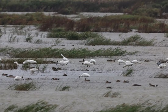 小天鵝、黑臉琵鷺、白琵鷺、豆雁、鴛鴦等國家一、二級重點保護動物相繼抵達東灘。保護區生態修復區內,雁鴨類集群游弋、鸻鷸類低空翱翔,秋季遷徙候鳥與越冬候鳥在此齊聚,或在淺灘中梳理羽毛,或在蘆葦叢邊尋覓食物,動靜之間盡顯生機與活力。