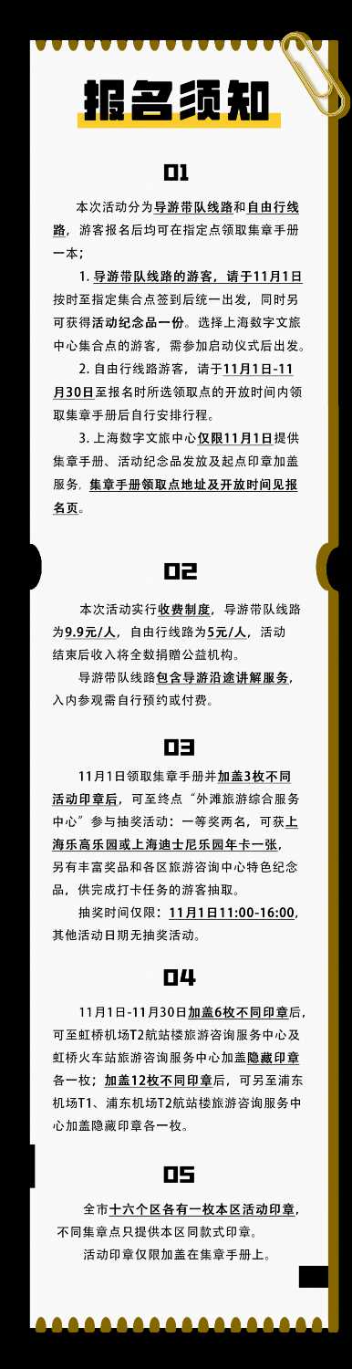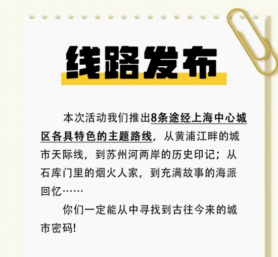 該活動以“一江一河”為主線,以“海派城市考古”“建筑可閱讀”等為線索,聯動各區旅游咨詢服務中心,用8條不同主題的路線,串聯起散落在全城的海派記憶,在梧桐樹影下,于尋常街巷里,探尋上海深厚的歷史文脈與摩登的都市氣息如何交融共生。讓我們一起用“兜馬路”的松弛心情,完成全域聯動的集章打卡拼圖!詳見↓