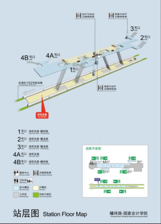 車站設施方面,蟠祥路·國家會計學院站同步開通1號口、2號口、3號口和4號口(4A、4B號口),共4個出入口。同時,為了方便乘客通行,車站安裝了3臺無障礙電梯。其中,1臺站廳至站臺的無障礙電梯位于付費區內,2臺地面至站廳的無障礙電梯分別位于非付費區靠近1號、3號出入口處。此外,車站公共衛生間(含無障礙廁所)位于站臺層,為乘客提供良好的服務體驗。