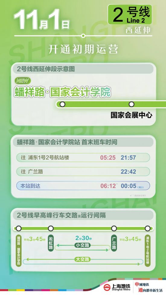 好消息!申通地鐵集團介紹,上海軌道交通2號線西延伸工程蟠祥路·國家會計學院站順利通過安全評估,具備初期運營條件,計劃于11月1日(周六)首班車起開站運營,并將助力新一屆進博會交通服務保障。詳見↓