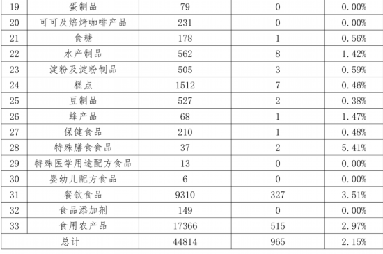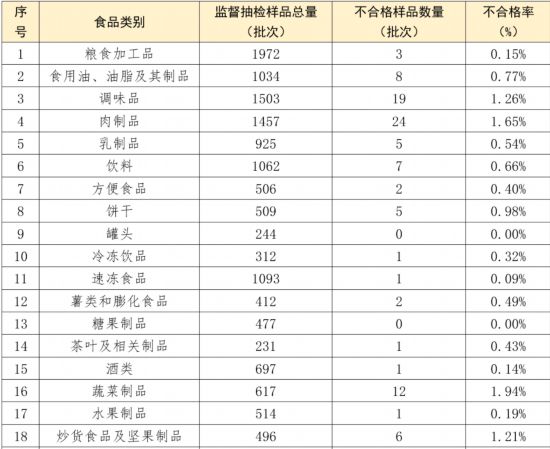 糖果制品、罐頭、可可及焙烤咖啡產品、食品添加劑、蛋制品、特殊醫學用途配方食品和嬰幼兒配方食品等7個食品大類的合格率均為100%。