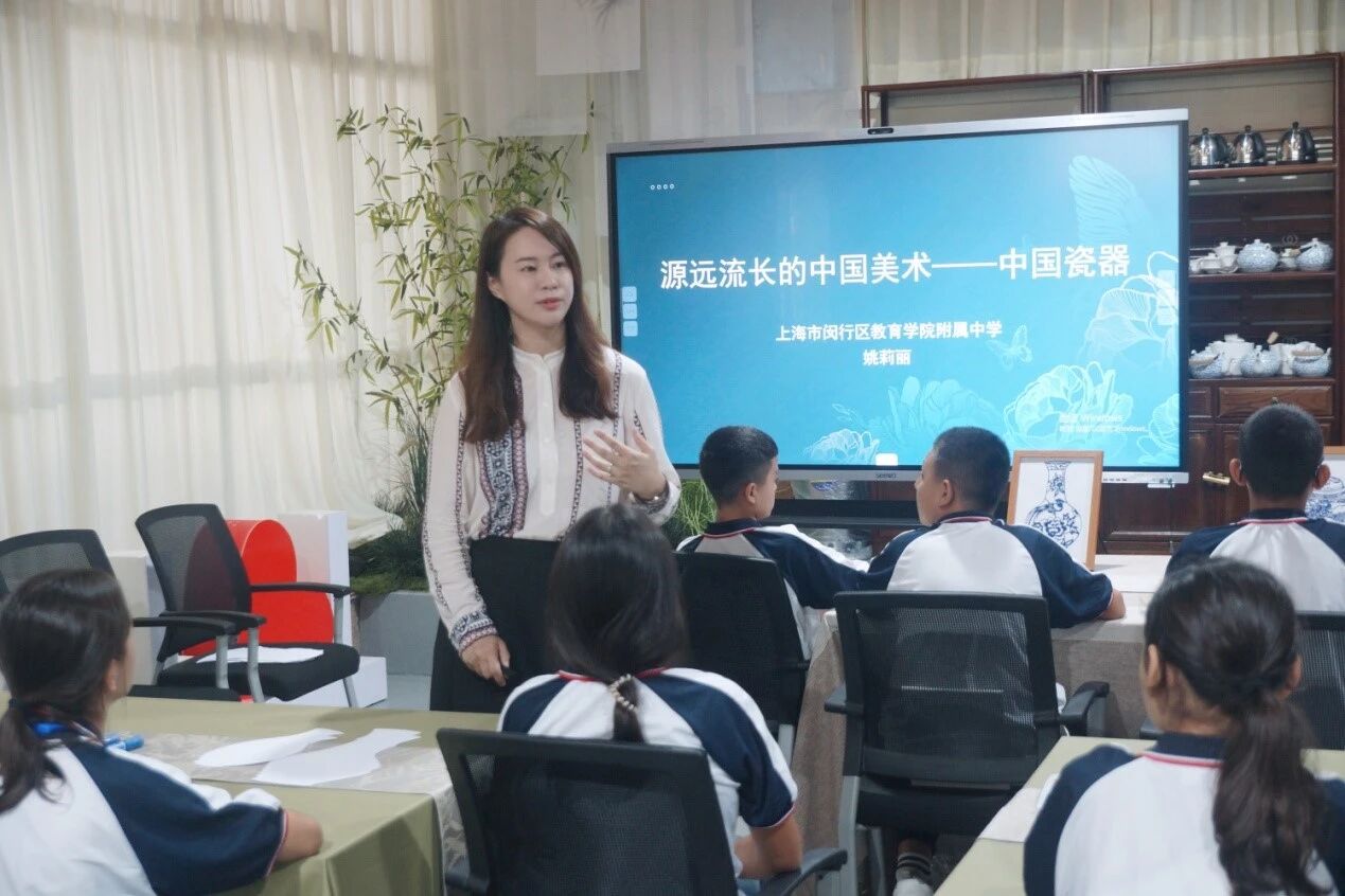另一邊,閔教院附中副校長姚莉麗開展了“源遠流長的中國美術——中國瓷器”美術創作體驗課,從瓷器的器型演變、紋飾寓意到背后的文化內涵,層層深入講解,還帶領學生嘗試開展創作,讓學生在動手實踐中感受傳統藝術之美。