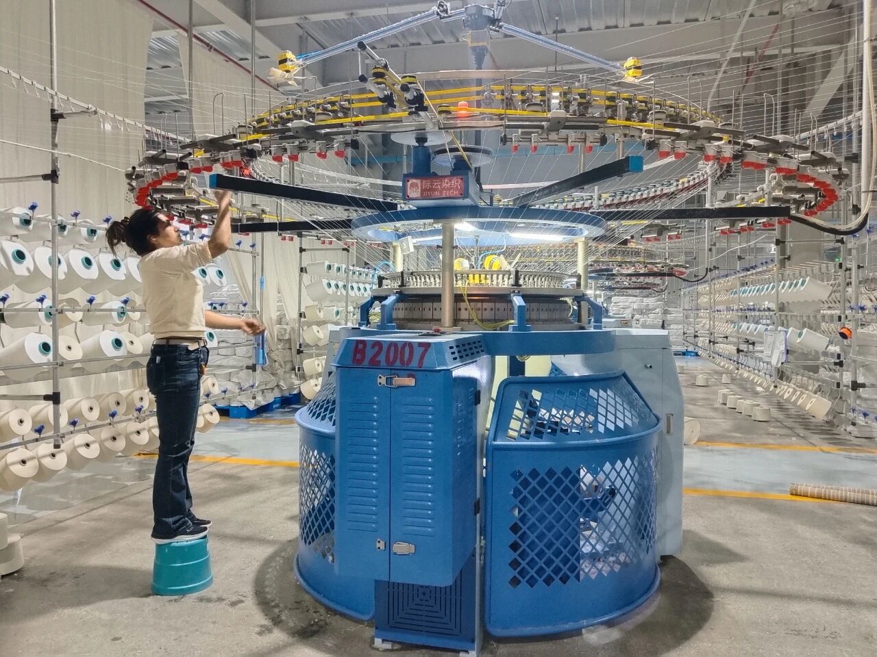 近年來,在上海援疆的推動下,巴楚逐漸形成了從棉花選種育種、規?;N植、籽棉加工、紡紗織布、印染、服裝加工、交易儲運全產業鏈。其中,為了填上巴楚棉花全產業鏈“最后一塊拼圖”,2023年,引進了新疆際云染織科技有限公司(簡稱“際云科技”),并成立工作專班,在短短5個月里建成21.67萬平方米的定制化廠房,確保企業在年底生產出喀什地區歷史上第一米印染針織布。
