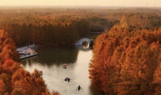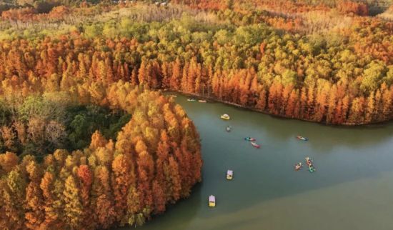 水杉枝葉由綠轉紅再變橙,層次豐富