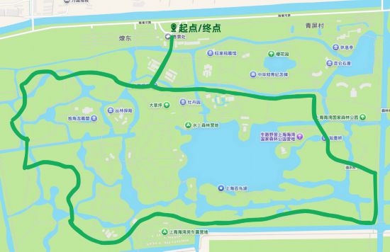 起點從公園主入口(隨塘河路1677號)進入,沿森林步道前行至300米紅杉棧道,穿過棧道后沿湖邊步道繞行,途經浮橋觀景臺、桂花林,最后沿銀杏大道返回起點,全程大約6.5公里。