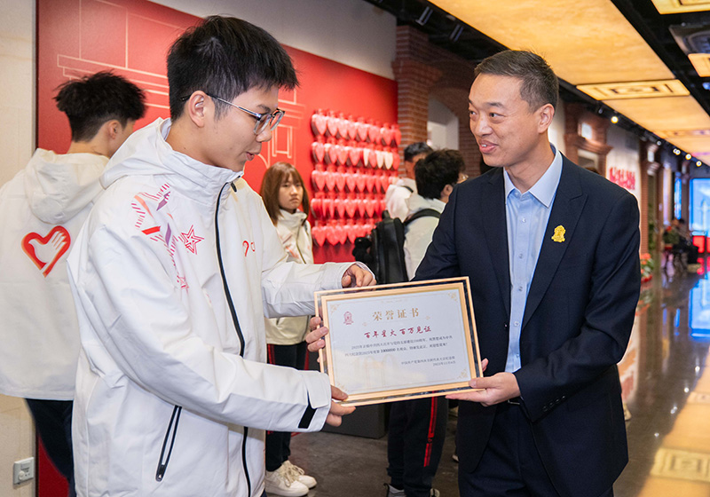 中共四大紀念館黨支部書記、館長徐雪琛為第一百萬名觀眾郭祺宇遞上兩份寓意深遠的“紀念禮”:一塊“海上磚”特制文創,寓意“初心如磐,共筑豐碑”;一套“中共四大主要成就”筆具盲盒,鐫刻著中共四大在黨的組織建設、群眾路線、革命武裝、民族運動、黨章完善五大方面的歷史成就。
