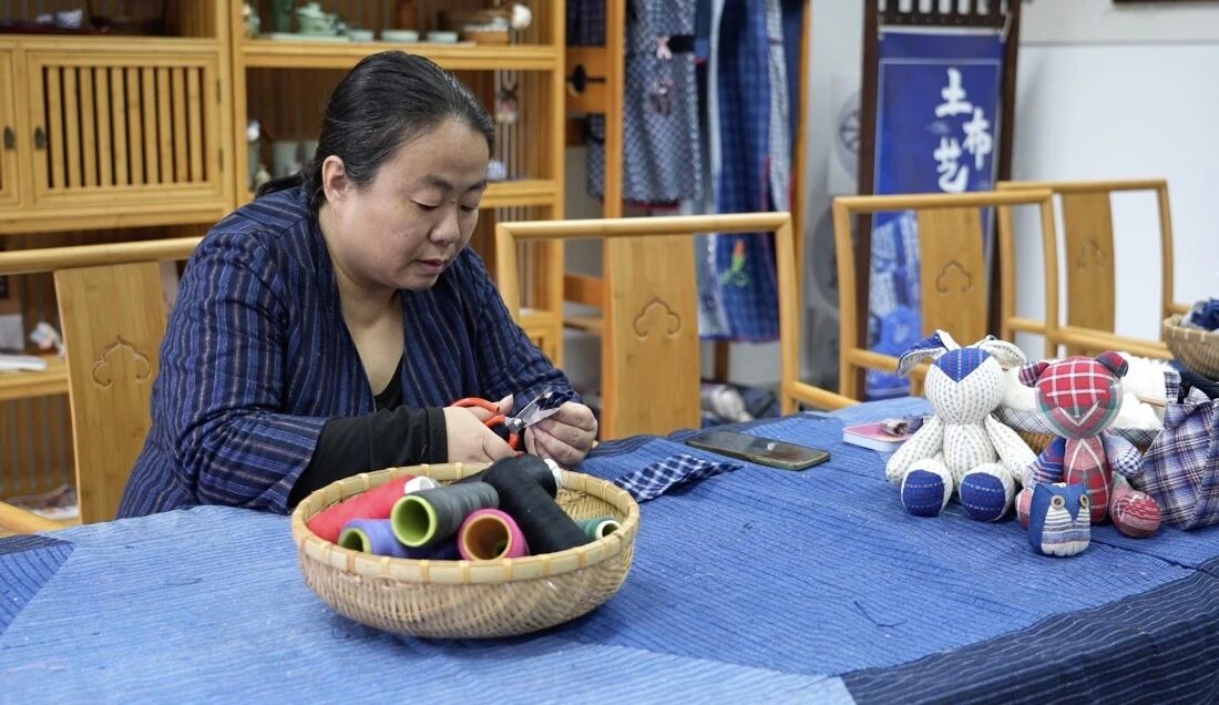 陸金鳳與土布的故事還要從十年前說起。陸金鳳是土生土長的廊下人,作為服裝打版師,她對手工紡織染色的純天然土布情有獨鐘。十年前,她開始正式接觸土布,并為土布尋找新的出路,從組織非遺土布展覽,到送土布課程進村居、學校、企業等,讓土布緊跟時代潮流。如今,在她的工作室內,土布被開發出玩偶公仔、書簽、手提包、小掛飾以及旗袍服飾等一系列產品,獲得不少市民的喜愛,也讓陸金鳳充滿獲得感。