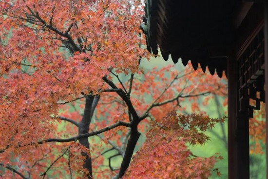 偶有葉片飄落,輕輕落在青石板上,或是順著亭臺的飛檐滑下,再配上幾株泛黃的銀杏、池邊疏朗的殘荷,園里的每一處角落,都透著深秋獨有的濃艷與雅致。