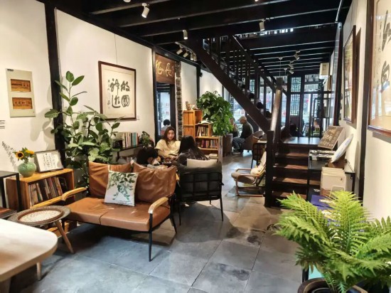 穿過小院、推開木門,室內空間被劃分為多個獨立的休憩處,藏書種類豐富,裝飾風格各異,卻有著相同的雅靜安適。